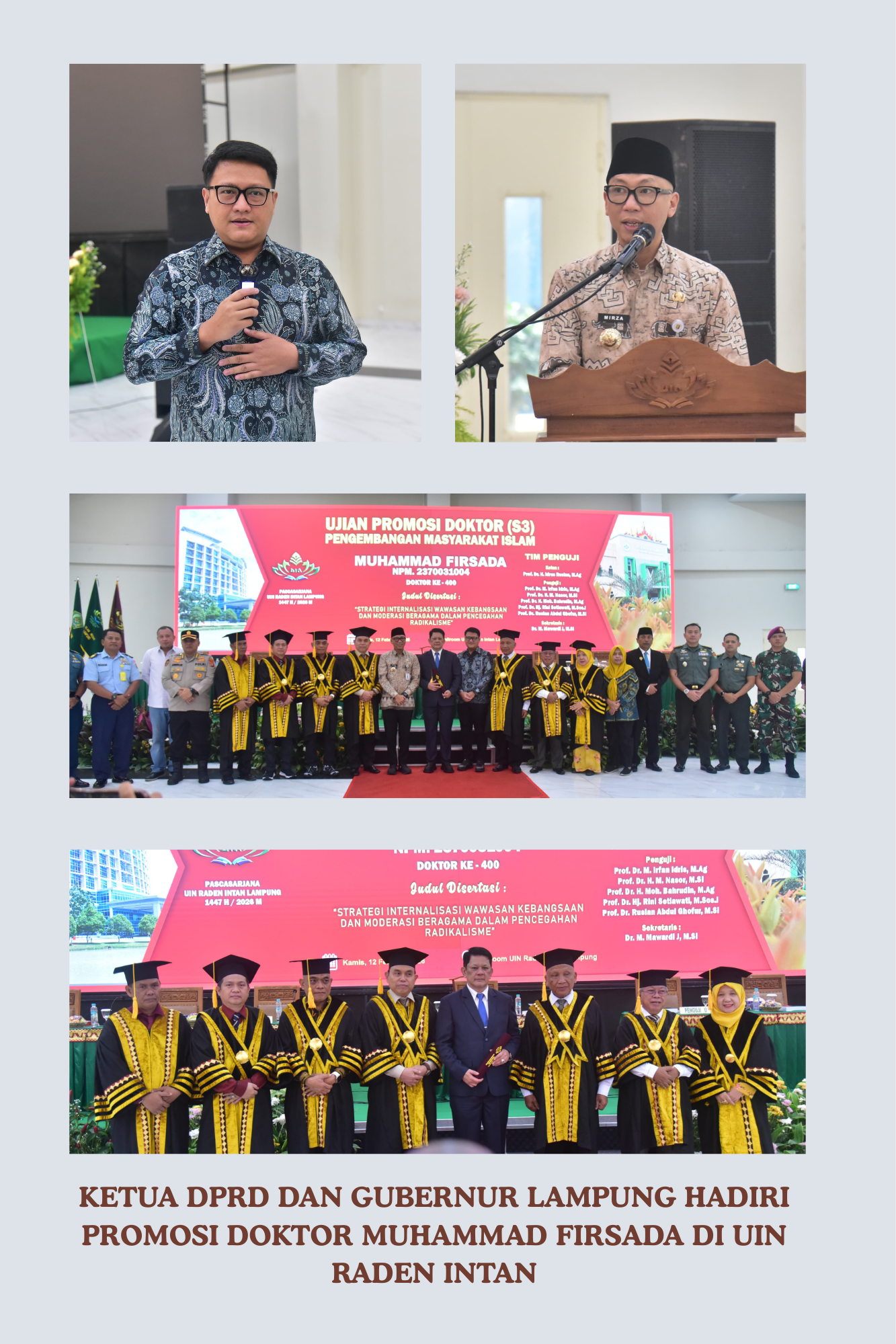 Bandar Lampung — Ketua DPRD Provinsi Lampung, A. Giri Akbar, SE., MBA., bersama Gubernur Lampung Rahmat Mirzani Djausal, ST., MT., menghadiri Ujian Terbuka Promosi Doktor Muhammad Firsada, M.Si., yang diselenggarakan Pascasarjana Universitas Islam Negeri (UIN) Raden Intan Lampung, di Ballroom UIN Raden Intan Lampung. Kamis (12/02/2026),